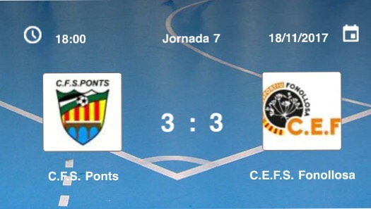 Aquest cap de setmana el CEFS Fonollosa s´ha desplaçat a Ponts el líder de la lliga amb 5 victòries de 5. A la primera part el partit no ha començat massa bé i ens n´hem anat al descans perdent per 3-0. A la segona part però, s´ha cregut amb les nostres possibilitats i Fonollosa ha acabat remuntant el partit i empatant 3-3. Un punt d´or molt treballat per seguir sumant en un partit vibrant per recordar molt de temps!!!